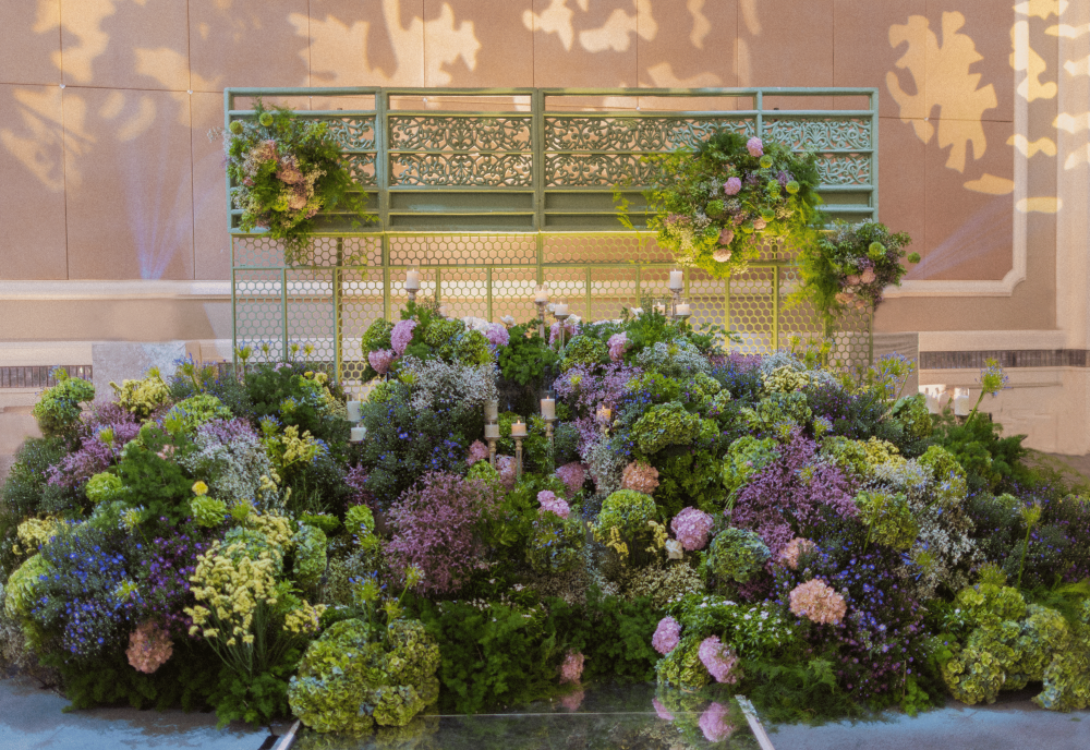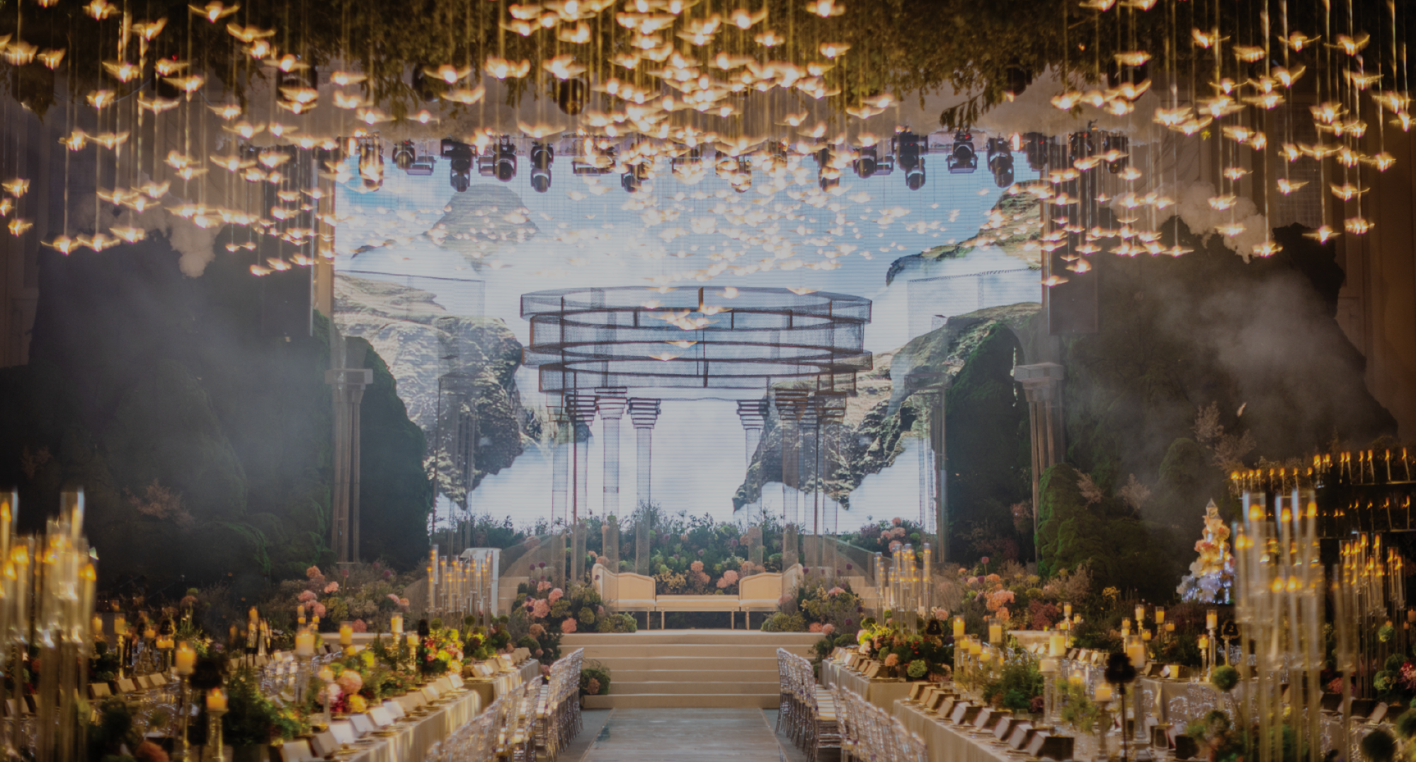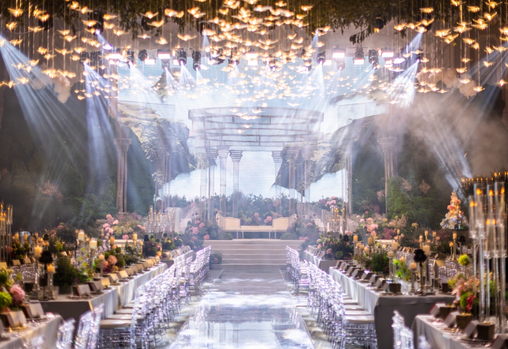 “The entrance to the wedding hall is a gateway for the enchantment of nature to be brought indoors while maintaining a touch of rustic charm. As guests step inside, they are greeted by the scent of forests and the soft glow of birds suspended from branches. The hall is bathed in warm, earthy tones to recreate the feeling of being surrounded by a dense forest.The wedding is a perfect ‘eden’ of the couple's love for the outdoors and the intimate, rustic charm of a forest and moss mountain settings, proving that even within for walls, nature's magic can be recreated to celebrate a love that stands as strong as the mountains and enduring as the forests.”